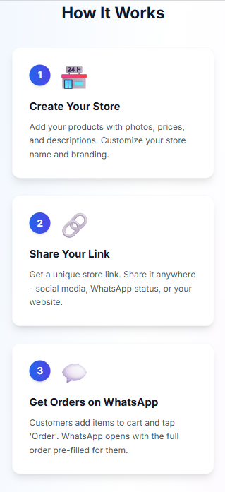 WhatsApp store creator for small businesses in emerging markets (India, Indonesia). Developed using VS Code with AI-assisted coding - combining thoughtful feature design with rapid iteration based on understanding user needs.